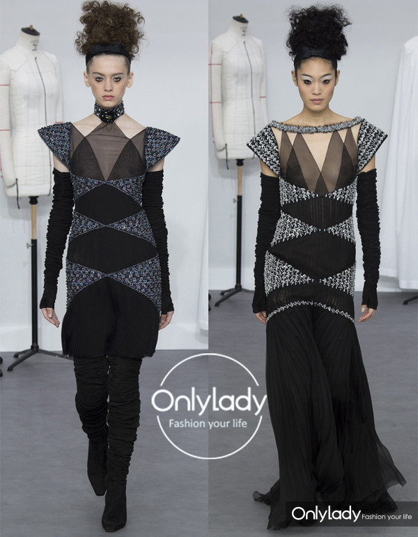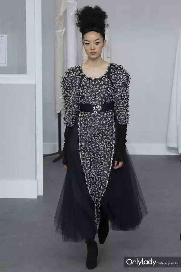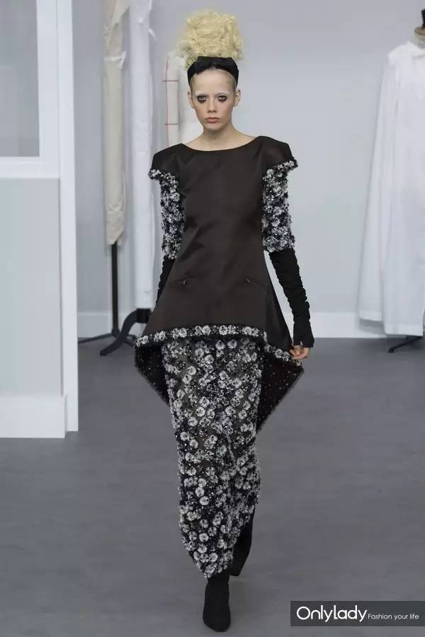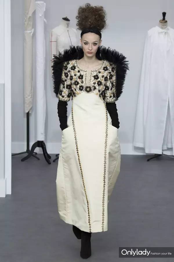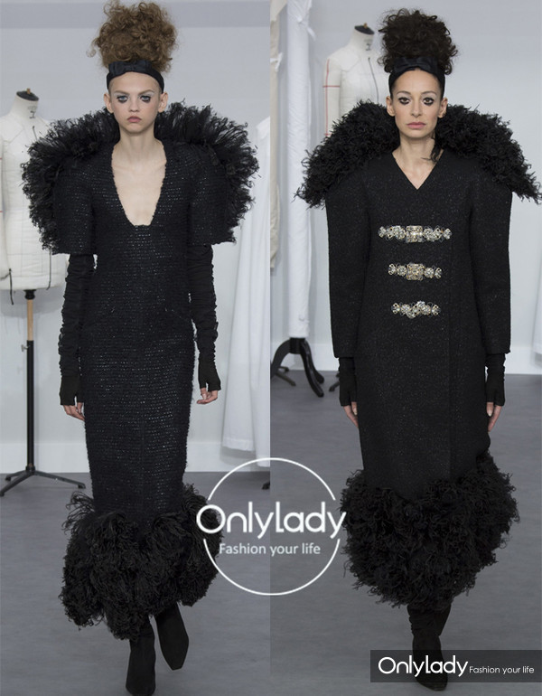 作為高級(jí)定制服裝的核心,這一季的晚裝沿襲了黑色、白色與銀色的經(jīng)典組合,長(zhǎng)款的晚禮服裙,以略帶銀線(xiàn)的黑色花織斜紋軟呢,搭配大量的羽毛裝飾,隆重高貴。