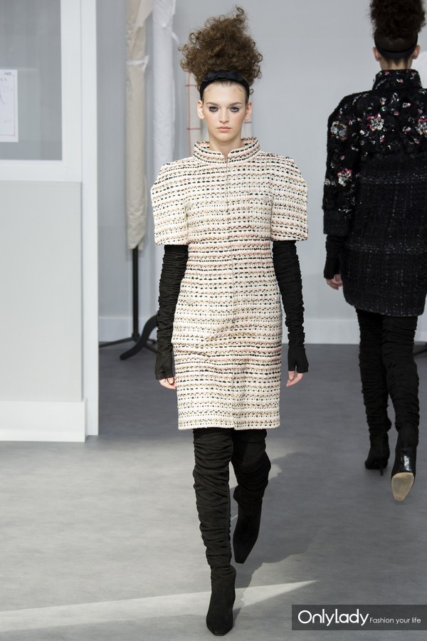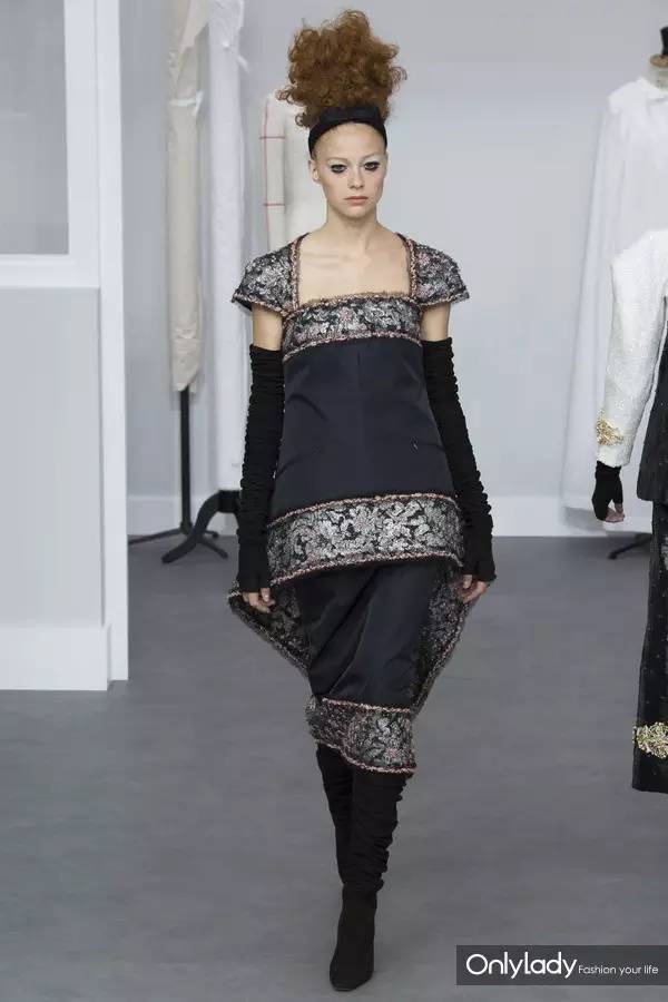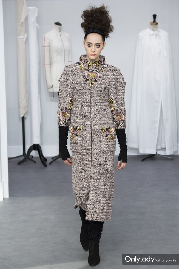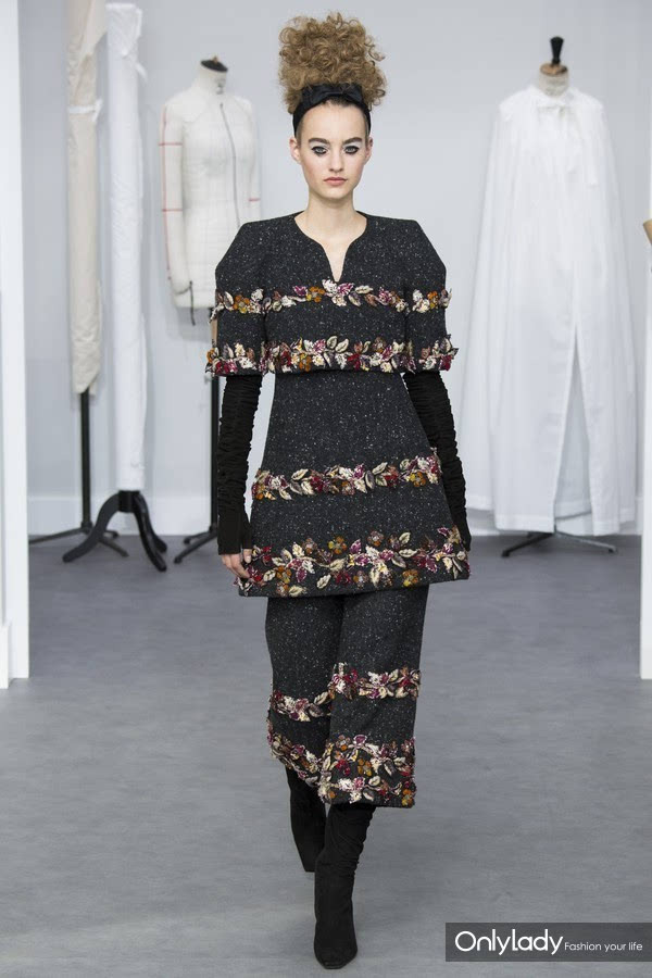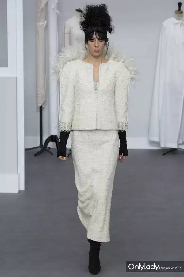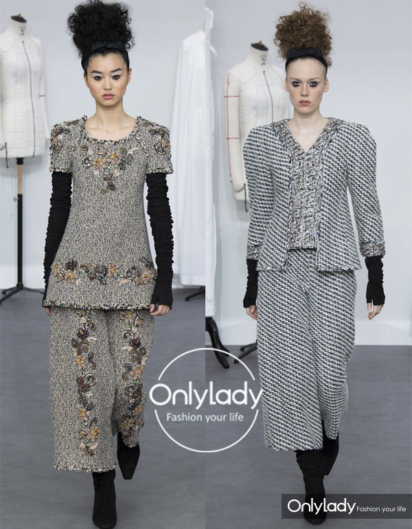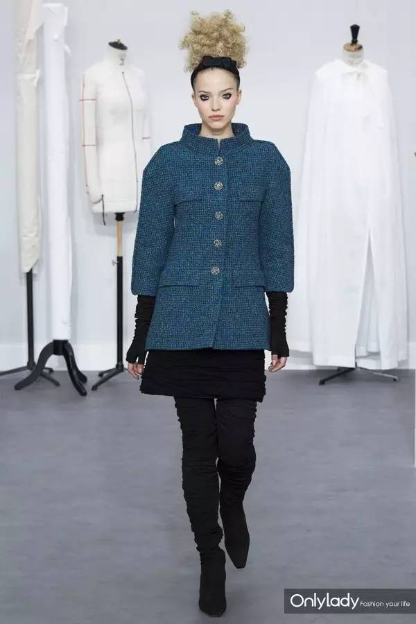 本次秀場(chǎng)變手工坊的概念可謂用心良苦,老佛爺意圖將成衣的制作流程全部公開(kāi),讓觀者全方位體驗(yàn)Chanel華服的誕生過(guò)程,從而向?qū)W⑶趭^的手工藝人致敬。至于造型,本次高定系列的一大亮點(diǎn)是斜紋軟呢套裝,在日裝的角色中具有舉足輕重的地位。