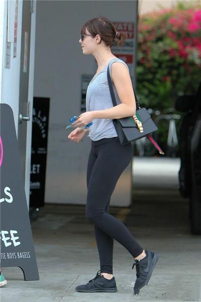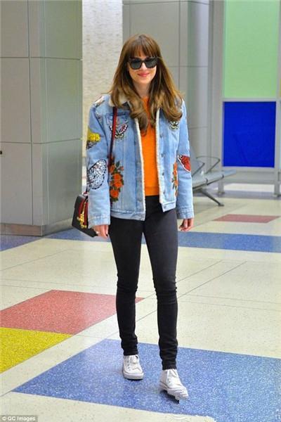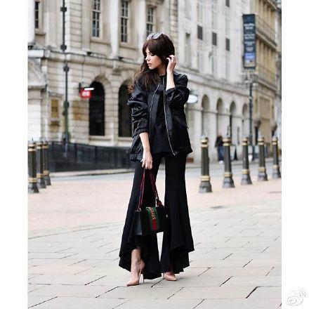 不要以為這款包只能搭配復古的look哦,Baby在機場用這款包配上中性風的皮夾克跟黑色緊身褲,有點色彩的包包不僅起到了畫龍點睛的作用,還顯得活力十足。