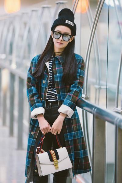 宋茜用Sylvie包包搭配格紋外套+皮褲,看著更個性一些。