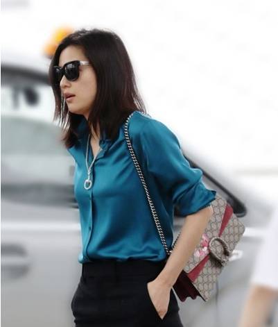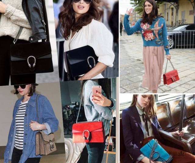 早在它成為眾多女星以及街拍潮人的迷妹前,全智賢就是最先背它出門的那一批女星,作為Gucci的代言人,女神和酒神包的氣質(zhì)超配噠。這款酒紅色麂皮絨點(diǎn)綴的花卉款明星潮人們背的最多。現(xiàn)在也就數(shù)這款和蟲鳥款最火。