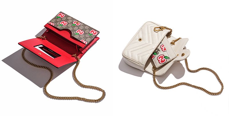 這次 GUCCI 七夕系列里的包袋主要有兩種材質,一部分采用了 GG Supreme 面料搭配紅色皮革飾邊,另一部分主打白色皮革,款式有 Padlock、GG Marmont、雙肩包、復古相機包、腰包、圓餅包、托特包、卡夾、迷你包、手機護套、雙 G 蘋果造型的零錢包。除此之外,系列還包括多款女士成衣以及帽子、鞋履、絲巾、配飾、腕表和家居飾件。