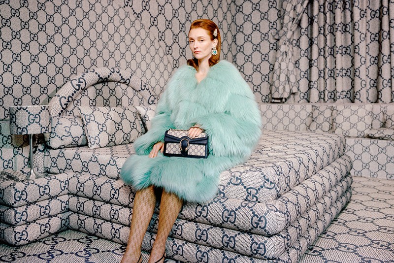午夜藍(lán)的GG帆布是以專屬的設(shè)計(jì)重賦新生,形象廣告將完全聚焦于主題。靜態(tài)圖片與動(dòng)態(tài)影片所捕捉的世界則全部都覆以GG菱格紋。從地板到天花板,場(chǎng)景所呈現(xiàn)的每一項(xiàng)物品都以經(jīng)典圖騰盛裝出場(chǎng)。品項(xiàng)融合背景,只凸顯藍(lán)色皮革飾邊和藍(lán)-紅-藍(lán)條紋織帶。