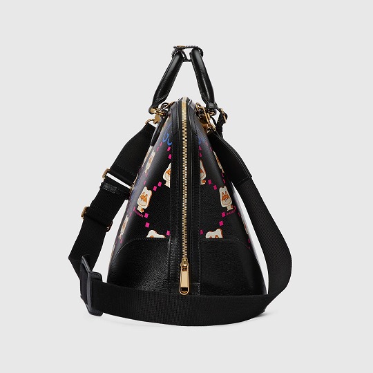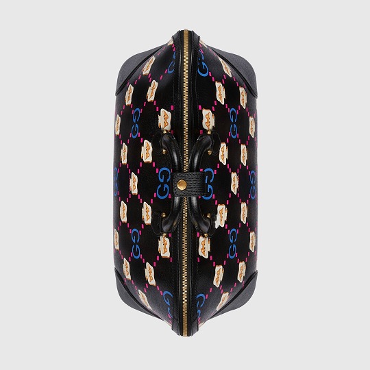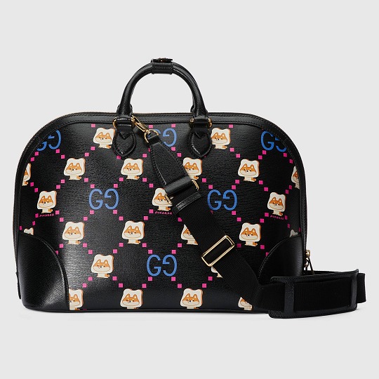 大號旅行包以黑色皮革為背景,搭配醒目的熒光粉和紫色 GG 印花和吐司柴犬圖案,38x28x20cm的尺寸適合假期短途出行,萌趣印花為旅途增添愉悅心情。
