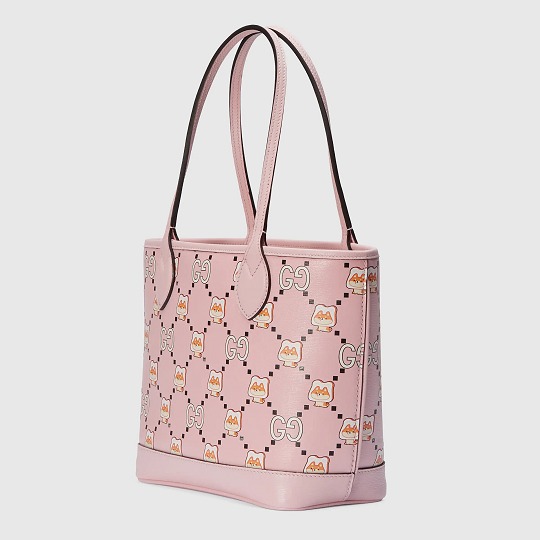Ophidia 迷你保齡球包和小號托特包采用淺粉色皮革制作包身,戴著吐司🍞頭套的呆萌柴犬占領 GG 圖案,菱格方塊中還隱藏著插畫師「Pikarar」的簽名。甜美粉嫩的色調和早春櫻花季格外適配,寬敞的內部空間也很適合郊游出行~