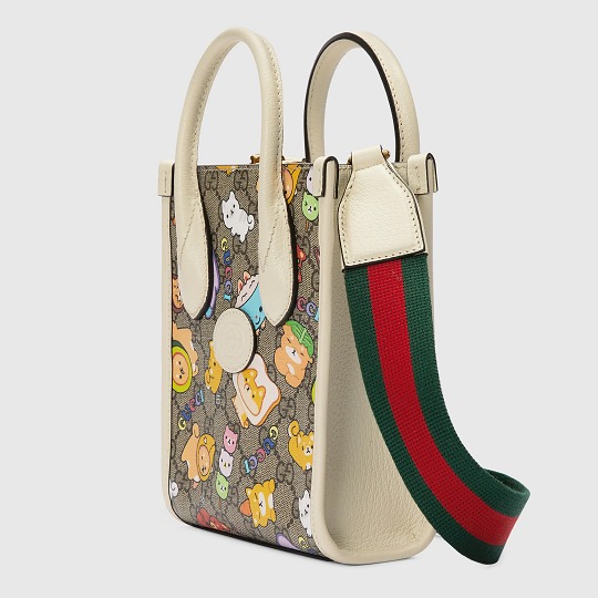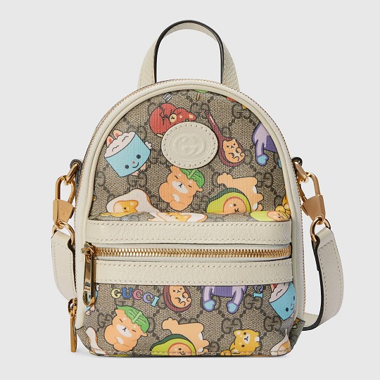 GG Supreme 帆布系列搭配白色皮革細節,色調清爽又富有活力,熱鬧的小動物聚會插畫看點滿滿。迷你手拎包采用俏皮的月牙輪廓,可拆卸鏈條肩帶實現多種背法。同系列還有迷你托特包、小號托特包、多功能肩背包、郵差包、腰包等多款包型,中性設計也可以搭配成情侶包出街。