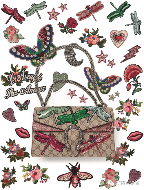 時尚部落客們人手一包的酒神包款,除了提供基本的尺寸以及皮革材質等客制服務,Michele也推出多款年輕女孩們最愛的刺繡布章,各種動物、植物花卉圖騰,如:蝴蝶、蜜蜂,蜥蝪、蜻蜓、蛇、玫瑰與牡丹等豐富圖案,創造了栩栩如生的Gucci花園,嫌不夠奢華,還能添加以施華洛世奇水晶鑲嵌的名字縮寫,自由的訂制選擇,讓妳能充分體驗當時尚設計師的樂趣!