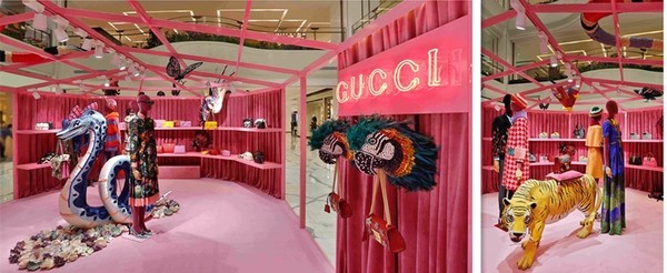 開幕當(dāng)天,SKP中庭展開了Gucci花園活動。此空間由古馳創(chuàng)作總監(jiān)亞力山卓?米開理(Alessandro Michele)親自設(shè)計。
