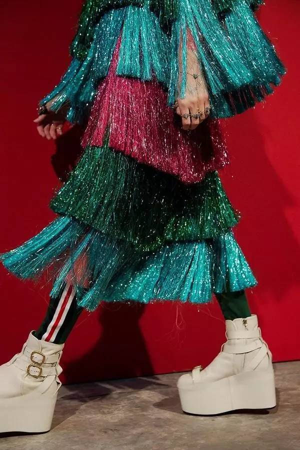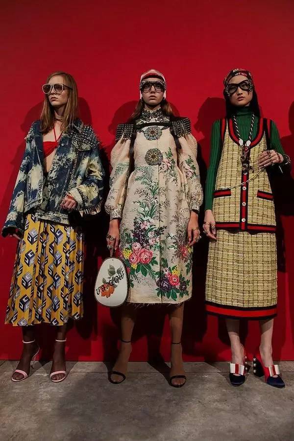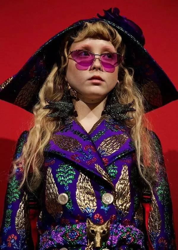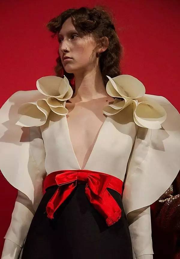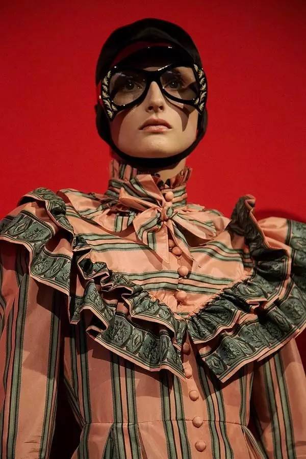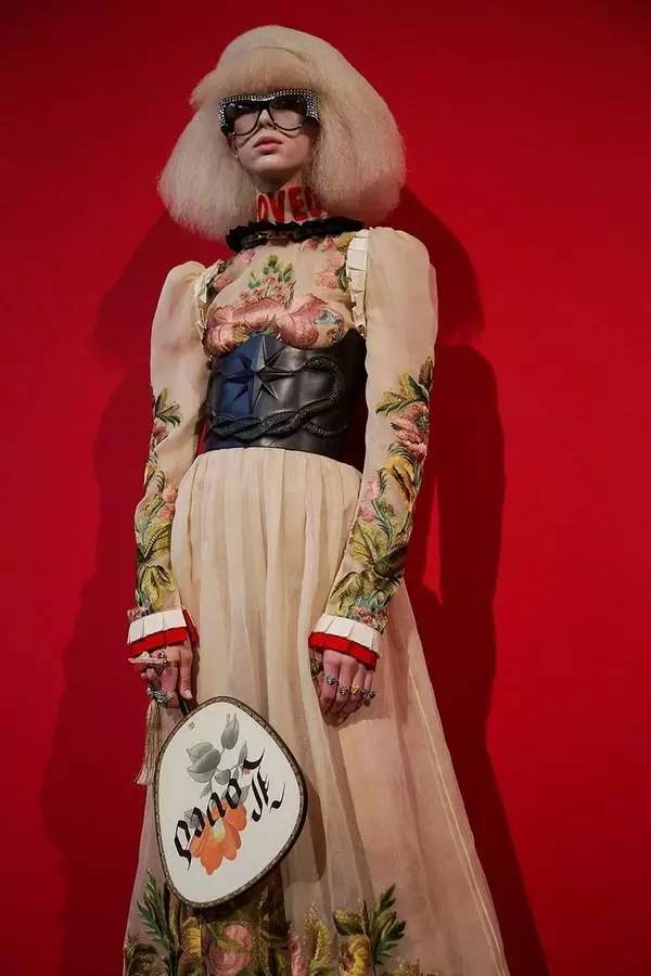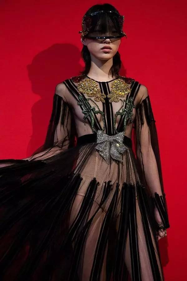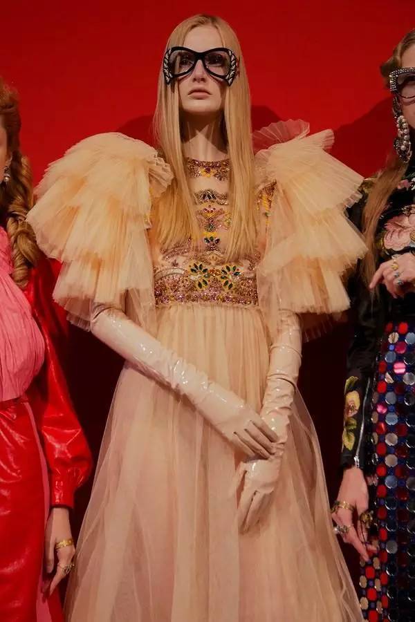 夸張的色彩與樣式就好像在上演一場精彩紛呈的戲劇,紗裙的曼妙被性感演繹,宮廷套裝正統(tǒng)中帶著新意,現(xiàn)代與未來的結合都在GUCCI中。