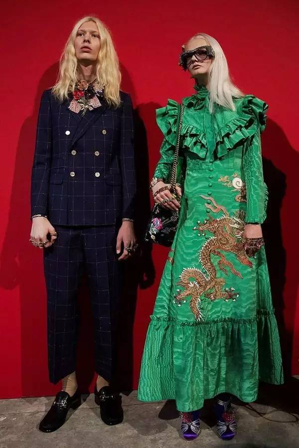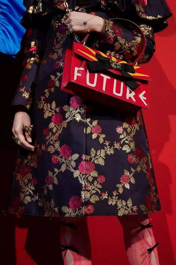 Alessandro Michele深深為中國元素著迷,此次的秀上模特們不僅拿著最新款的包包,中式娟扇更是吸引人目光,服裝上的龍、牡丹花樣刺繡和雙排扣設計在時尚中帶著中式古典。