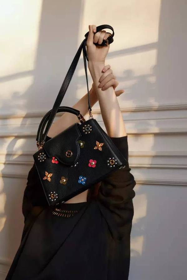 全新 Capucines 手袋既可優雅又可前衛,詮釋著巴黎女郎的獨特與時髦。優雅的色彩搭配與細節,將時光帶回到1854年的巴黎 Capucines 大街上,找尋隱匿的昔日情懷。忽而又回到當下,金屬飾釘與 Monogram 花朵在手袋上融合,現代魅力在眼前綻放開來。