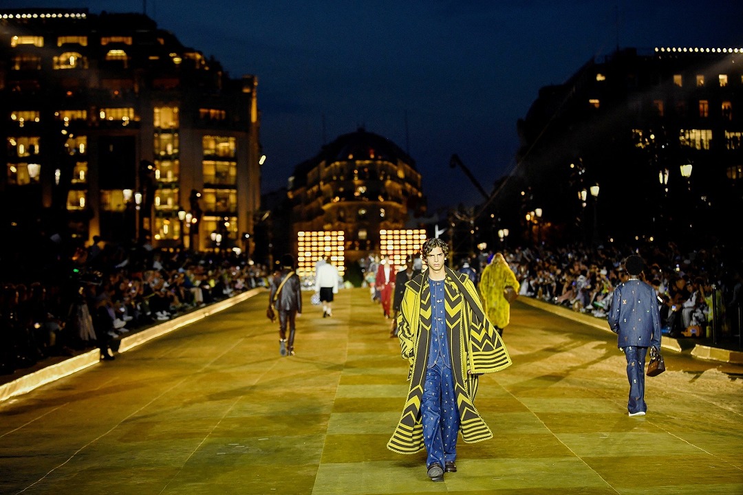秀場選址于塞納河畔的巴黎新橋(Pont Neuf),與不遠處的 LV 工作室相望,新橋體現著巴黎與 Pharrell Williams 的家鄉弗吉尼亞州之間的隱喻聯系。橋面裝飾以金色 Damier 棋盤格圖案并以舞臺聚光燈為背景墻,呼應「太陽」主題。