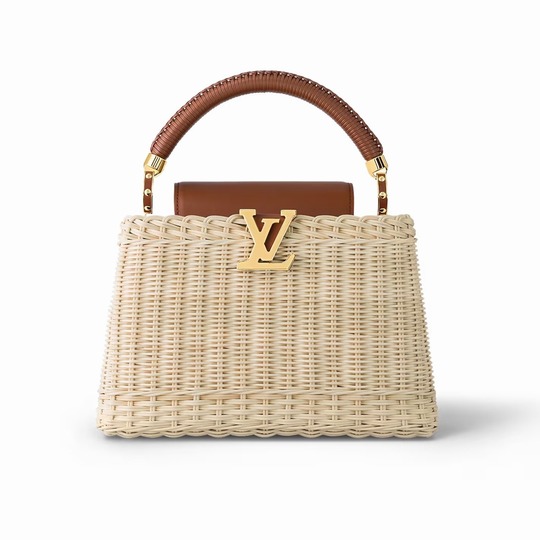 >奢侈品資訊>奢侈品動(dòng)態(tài)>路易.威登(Louis Vuitton)> Louis Vuitton 上市新款 Capucines 手袋:天然藤編,波浪包底,鴕鳥皮,靈動(dòng)鏈條Louis Vuitton 剛剛更新2023夏季新款 Capucines 手拎包,以輕快明麗的玫粉、亮橘、薰衣草紫等色彩為基調(diào),包包飾以珠寶般的樹脂手柄、珍貴奢華的鴕鳥皮翻蓋、波浪形包底、天然藤條編織包身等元素,展現(xiàn)設(shè)計(jì)師對(duì)經(jīng)典手袋細(xì)節(jié)的新想象。