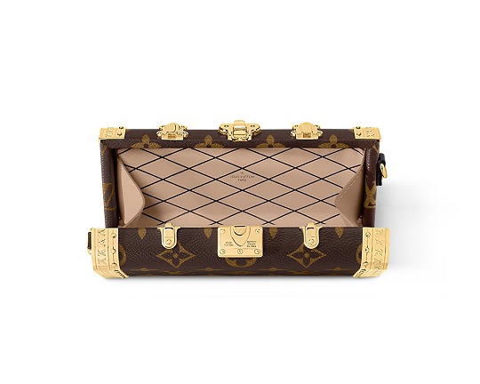 Petite Malle Capitale 手袋新增頂部手柄設(shè)計(jì),營(yíng)造出復(fù)古優(yōu)雅格調(diào),Monogram 帆布包身搭配黑色金屬包角、皮革飾邊和可拆卸編織鏈條,用當(dāng)代視角重新演繹古典硬箱。