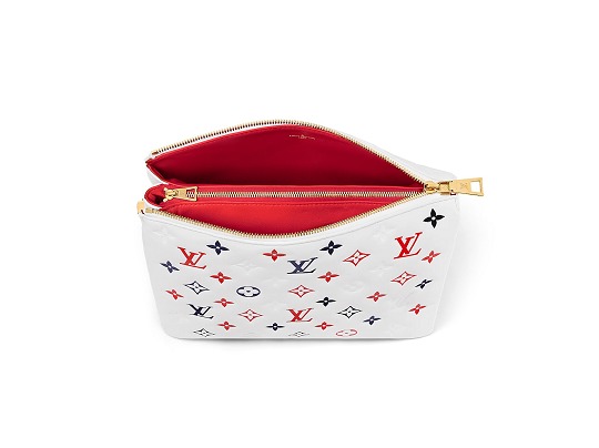 柔軟的小羊皮上描摹法國(guó)國(guó)旗🇫🇷紅白藍(lán)三色Monogram 圖案,用來打造 Coussin 小號(hào)手袋和 Petite Malle 小硬箱,致意法蘭西的歷史傳承。