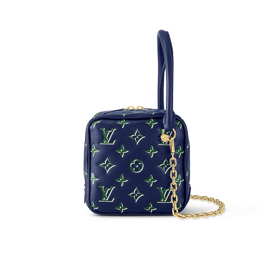 Coussin 小號(hào)手袋采用 Monogram 壓紋羊皮革塑造出蓬松飽滿的廓形,本季渲染以巴黎路牌的復(fù)古藍(lán)綠配色,并將其延伸至可拆卸肩帶和樹脂鏈環(huán)之中。同系列還有一款 Square 立方體手袋,矚目立方構(gòu)型在藍(lán)綠色烘托下更具造型感。