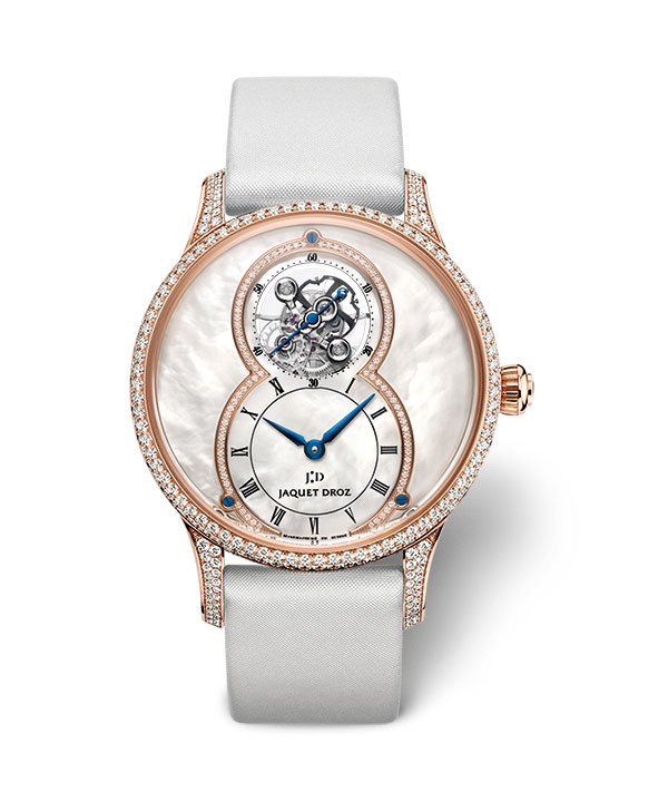 同時雅克德羅首次為陀飛輪裝配硅質(zhì)擒縱叉和擺輪游絲,讓此令人目眩神迷的微雕杰作具備高精準(zhǔn)度,珍珠母貝陀飛輪大秒針兼具優(yōu)雅設(shè)計和卓越技術(shù)性能,精巧獨(dú)妙,彌足珍貴。此表款限量發(fā)行88枚。數(shù)字8的輪廓與表盤設(shè)計相互呼應(yīng),表盤熠熠閃耀著珍珠母貝的柔光淡彩與鉆石的璀璨光芒。