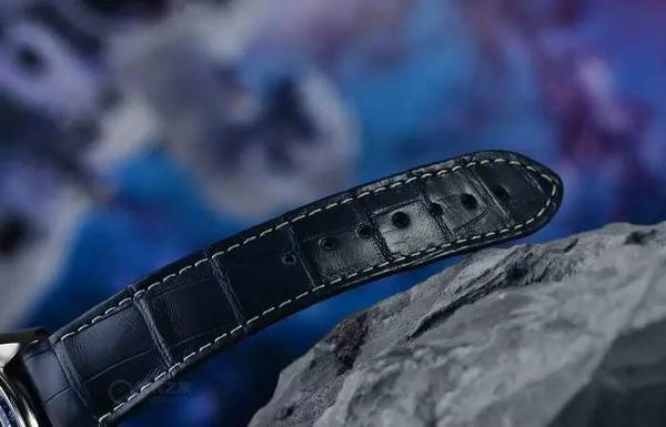 腕表配備與藍色表盤相呼應的藍色皮表帶,飾以白色縫線裝飾。