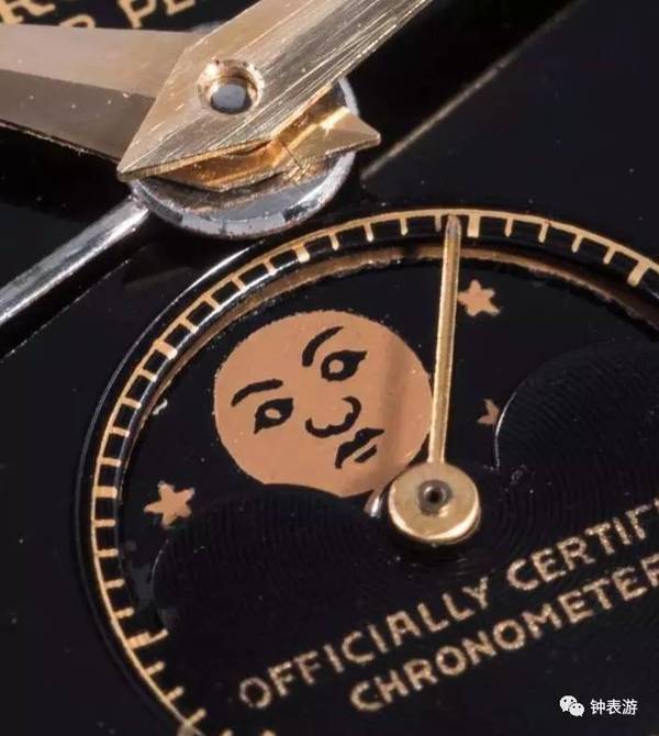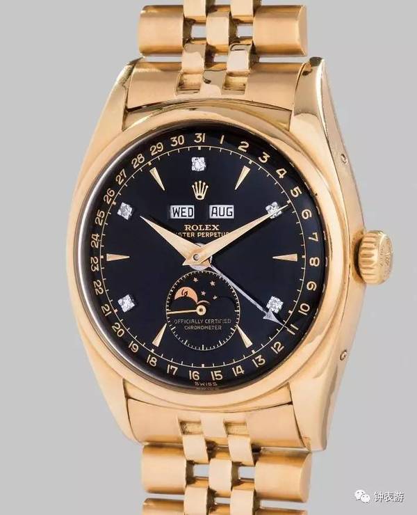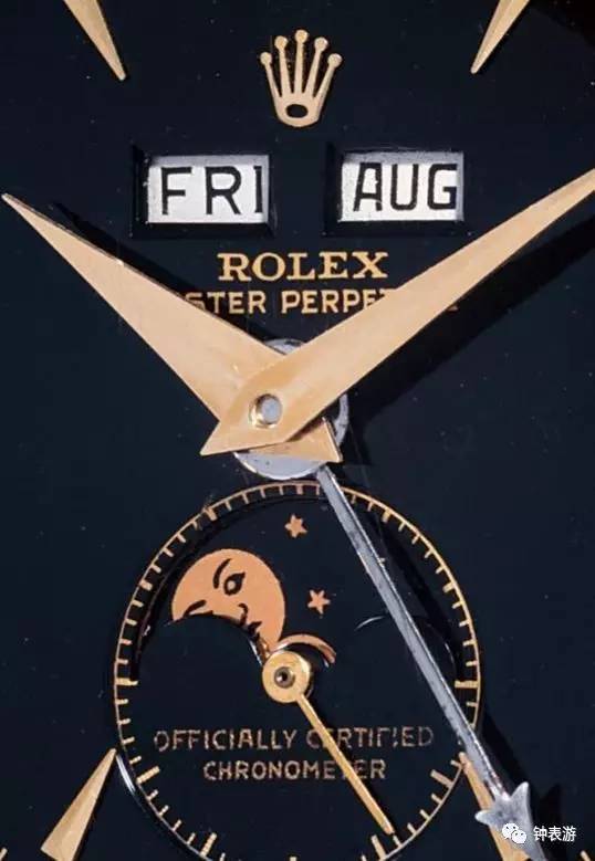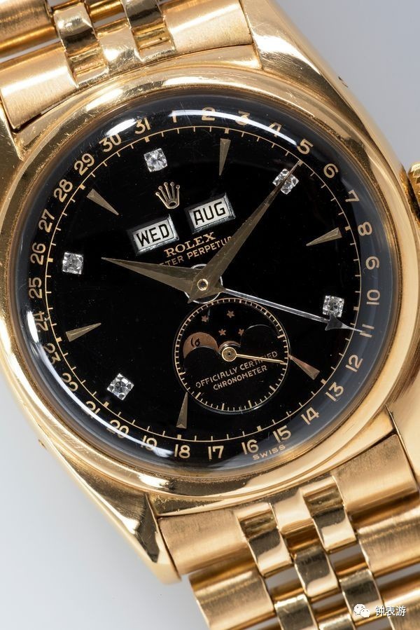其次,它的表盤設計有很多難得一見的與同時期腕表的區別:1,5顆碩大的鉆石作為12、2、4、8、10點位的時標,這已注定它的罕有。2,有趣的是,因為12點位的大鉆石時標,勞力士的皇冠被下移,因此也無法使通常在皇冠下的“Rolex Oyster“(勞力士蠔式)在星期和月份窗口之上,而是被少見地放到了窗口下面;同時“Officially Certified Chronometer”(官方天文臺認證)的字樣也被移到了月相窗口下面,而不是在通常的表盤的中心位置。這樣的變化,會令勞力士研究者和愛好者瘋狂的,因為太少見和稀有了!