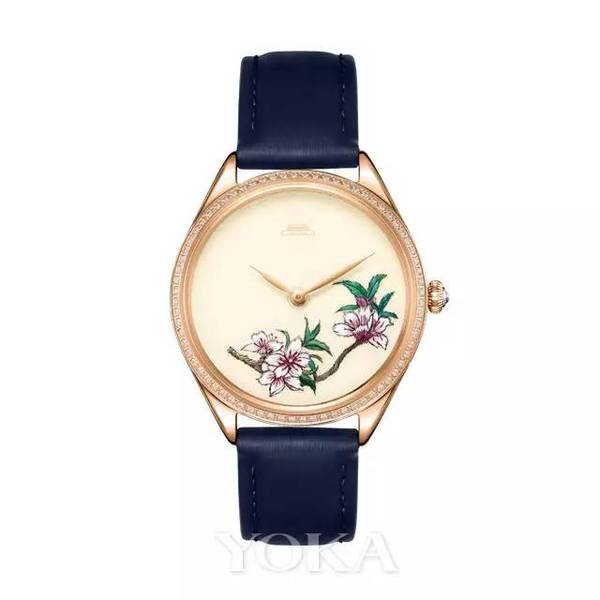 北京表絲語系列手工蘇繡桃花腕表,精心挑選28種不同顏色的絲線,一根絲線分成16股細線,細若發絲;一個蘇繡大師至少需要72個小時,才能將"桃之夭夭,灼灼其華"的美態純手工呈現在表盤上,是東方美及工匠精神的生動演繹。