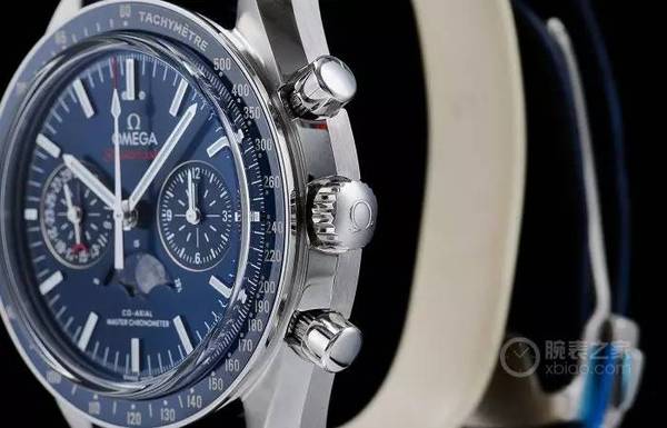 精鋼表冠上凸雕歐米茄品牌標識,表冠側面設有防滑紋理,便于佩戴者操作精致小巧的表冠。表冠上下分別設有計時開始及暫停按鈕和計時歸零按鈕。