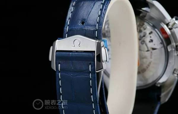 腕表配備與藍色表盤相呼應的藍色皮表帶,飾以白色縫線裝飾,搭配經過磨砂拋光處理的精鋼折疊表扣。