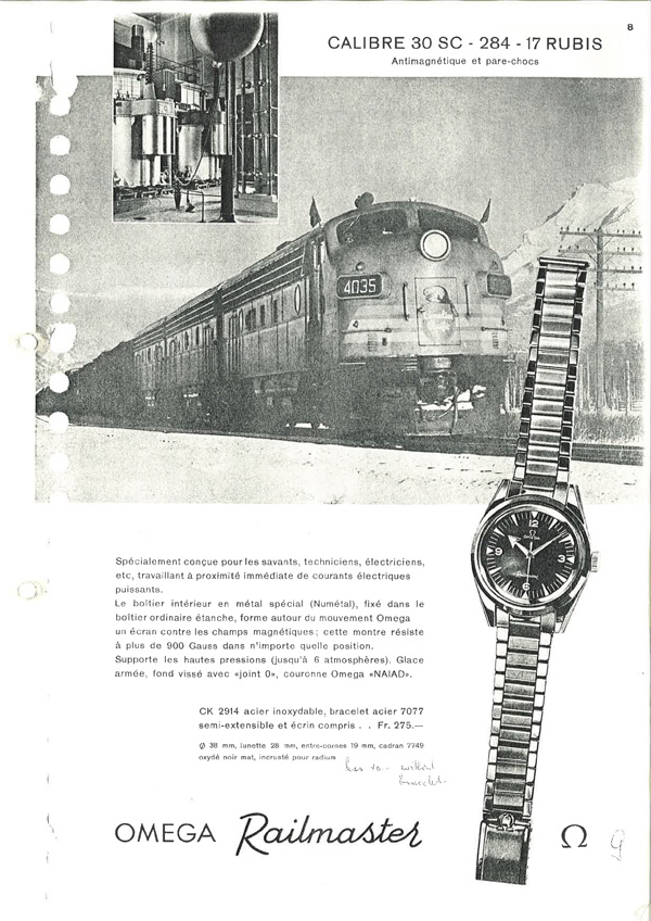 50年代初航空與鐵路運輸行業都迅猛發展,隨之而來的磁場也更為強大。與此同時,英國國防部開始尋找可以勝任飛行任務的腕表。歐米茄于20世紀40年代末就已發布了一系列防磁機芯。這些機芯運用創新合金材質,并置于以“法拉第籠”為設計原理的表殼中,并配備由新金屬材質制成的堅實表盤,為機芯阻擋磁場的干擾。由于腕表堅實的構造和非凡的防磁性能,歐米茄于1953年成為英國國防部的合作伙伴,為其提供防磁性能卓越的飛行員腕表。同年,歐米茄為備受磁場困擾的專業工作者設計了一款防磁腕表,并取名“鐵霸”。通過與加拿大鐵路公司為期一年的合作,歐米茄將每一枚防磁腕表送至加拿大鐵路局進行測試和研究。1957年,歐米茄正式在市場上推出鐵霸CK2914腕表。