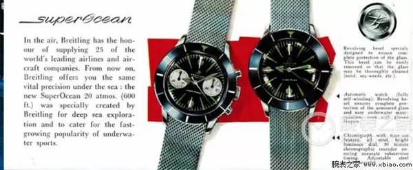 Ref.1004(自動三針)和Ref.807(手動計時)掀開了百年靈超級海洋潛水腕表的歷史篇章。有趣的是,在下面的廣告中,百年靈與航空界的深厚淵源被用作營銷元素和質量保證。