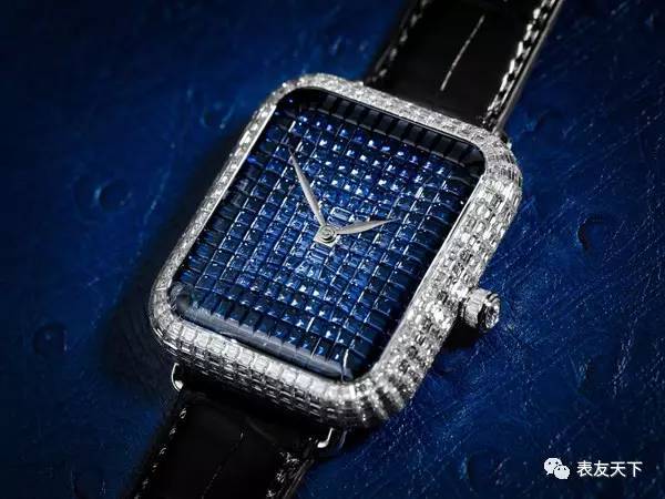 表盤鑲滿232顆矩形切割藍寶石——好似一面屏幕,只不過每個像素都是一顆藍寶 石。同時,長方形表殼鑲滿了矩形切割的鉆石,四角采用優雅的圓潤造型,符合人體工學設計,頗 為精致考究。一千種細微不同的藍色調打造出腕表的單色外觀,這絕對撐得上一款“與世隔絕”之作 ——它承諾重新找回丟失的時間:為您自己、為您的朋友、為您的家人——在您的手腕上,再也沒 有濾鏡,再也沒有各種浪費時間的工具。至少4天的動力存儲,手動即可上滿弦。