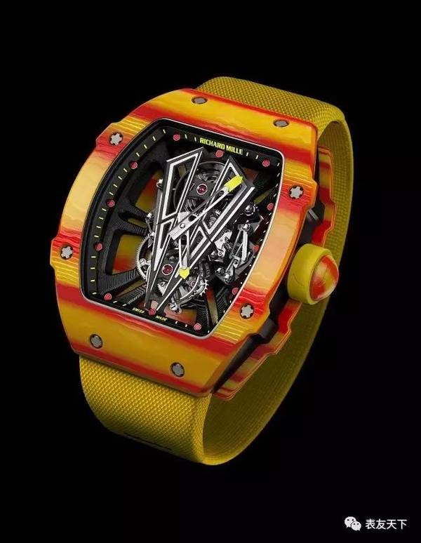 RM27-03陀飛輪腕表採用紅黃色調(diào)TPT石英表殼,奪目耀眼。