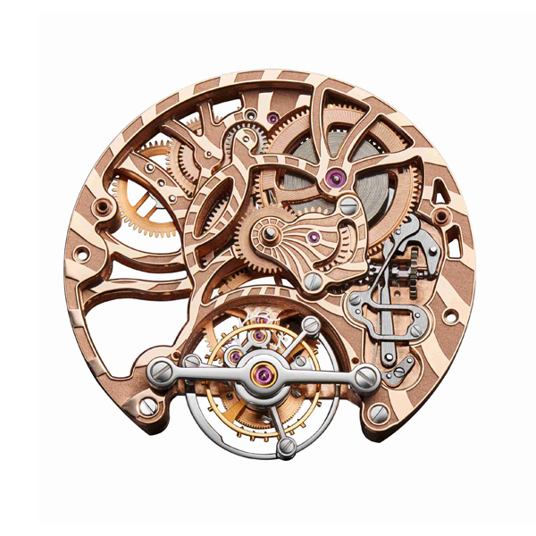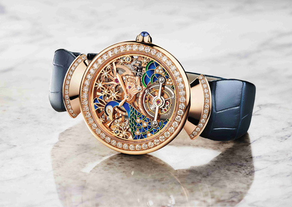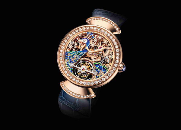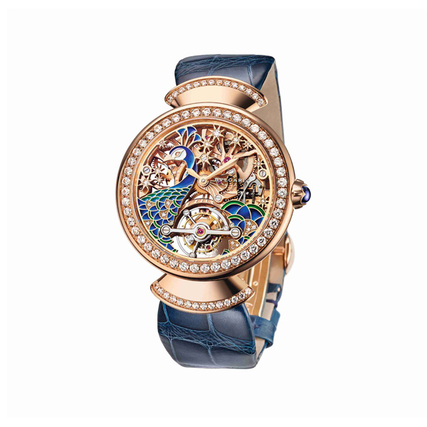 第三款繪有孔雀圖騰的腕表,搭載更為復雜精密的手動上鏈機械鏤空陀飛輪機芯。在這一作品中,復雜制表工藝與精湛的藝術創(chuàng)作之間碰撞出耀目火花,啟發(fā)無窮想象,令人贊嘆叫絕。機芯采用鏤空工藝,營造出美輪美奐的光影與通透效果。精妙的手繪孔雀圖騰與表盤上鑲嵌的鉆石融為一體,并作為鏤空機芯不可分割的一部分與之相映成趣,透過藍寶石透明表面和表背,可一覽精致的機芯細節(jié)。巧奪天工的精湛工藝,不僅令眼光獨到的行家和鐘表愛好者為之心馳神往,更令初識者嘆為觀止,如癡如醉。
