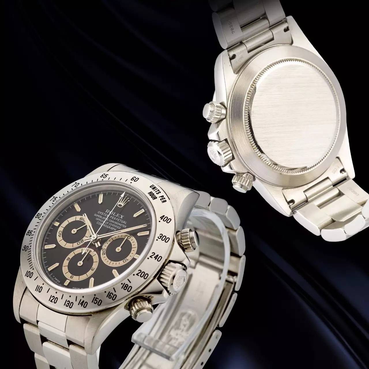 勞力士16520型號「COSMOGRAPH DAYTONA」精鋼自動上鏈計時鏈帶腕表,表殼編號W903127,年份約1996。