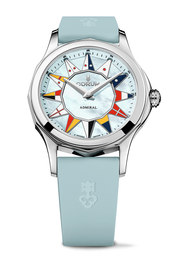 同樣也是十二邊形金屬表殼與特大航海旗設計,海軍上將Legend 32卻有著柔美的氣質,32毫米貝母質地表盤,顯得波光粼粼,體現獨特的溫婉女性魅力。淺藍色的配色,仿佛一汪靜謐的碧水,透露別樣柔情。