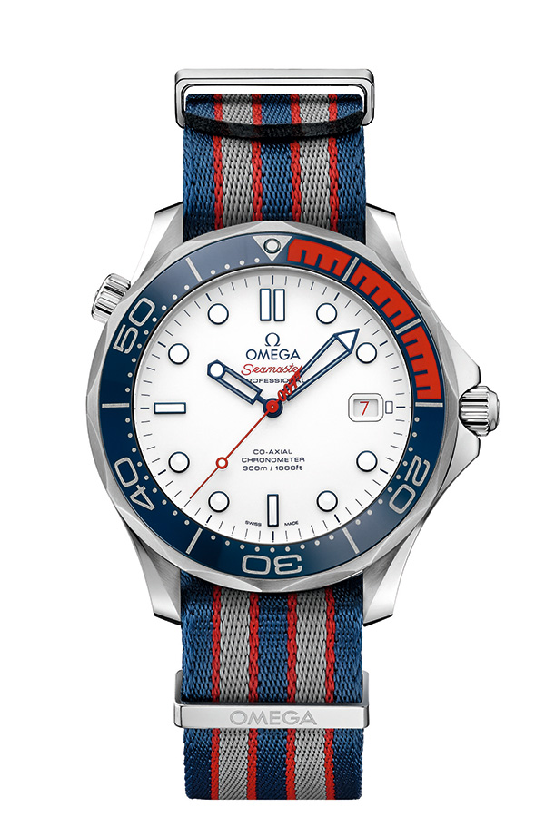 歐米茄海馬系列300米潛水表“指揮官”限量版腕表以紅、白、藍三色設(shè)計,以致敬英國皇家海軍,為腕表增添一份莊嚴之感。