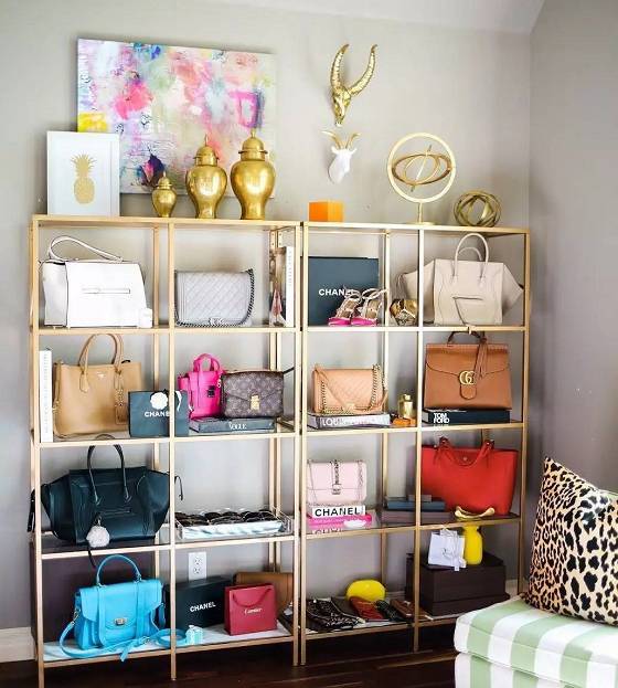 包包收納的時候最好不要懸掛起來,容易磨損包包的把手和肩帶的位置。所以最好是放平在架子上。