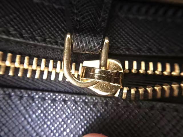 1、由于本身prada品牌存在四套不同五金 亮面 亮面啞光 啞光做舊 還有拉絲。拉絲面最少。所以不同廠出來的五金顏色和字母深淺存在略微差異。不過logo中印章清晰度都是很清晰的。至少可以在某一光線角度下看出清晰logo印章及1913prada誕生年份。印章感覺好似小蠻腰。絕對不會是胖胖那種。而拉鏈則都是Lampo拉鏈。拉鏈底部有lampo刻字。有些男款手包是使用riri拉鏈,底部同樣有riri刻字。并在riri下方有數字標號。金色logo及拉鏈使用鍍金五金。易磨損掉色,這已是公認!