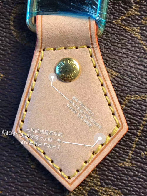 monogram speedy lv枕頭包是雙手提設計,連接手提是四處的四邊形皮塊。這塊皮上的縫線、壓紋、剪裁都十分工整,右下方縫線六針,有三針回線,針線粗細一致。