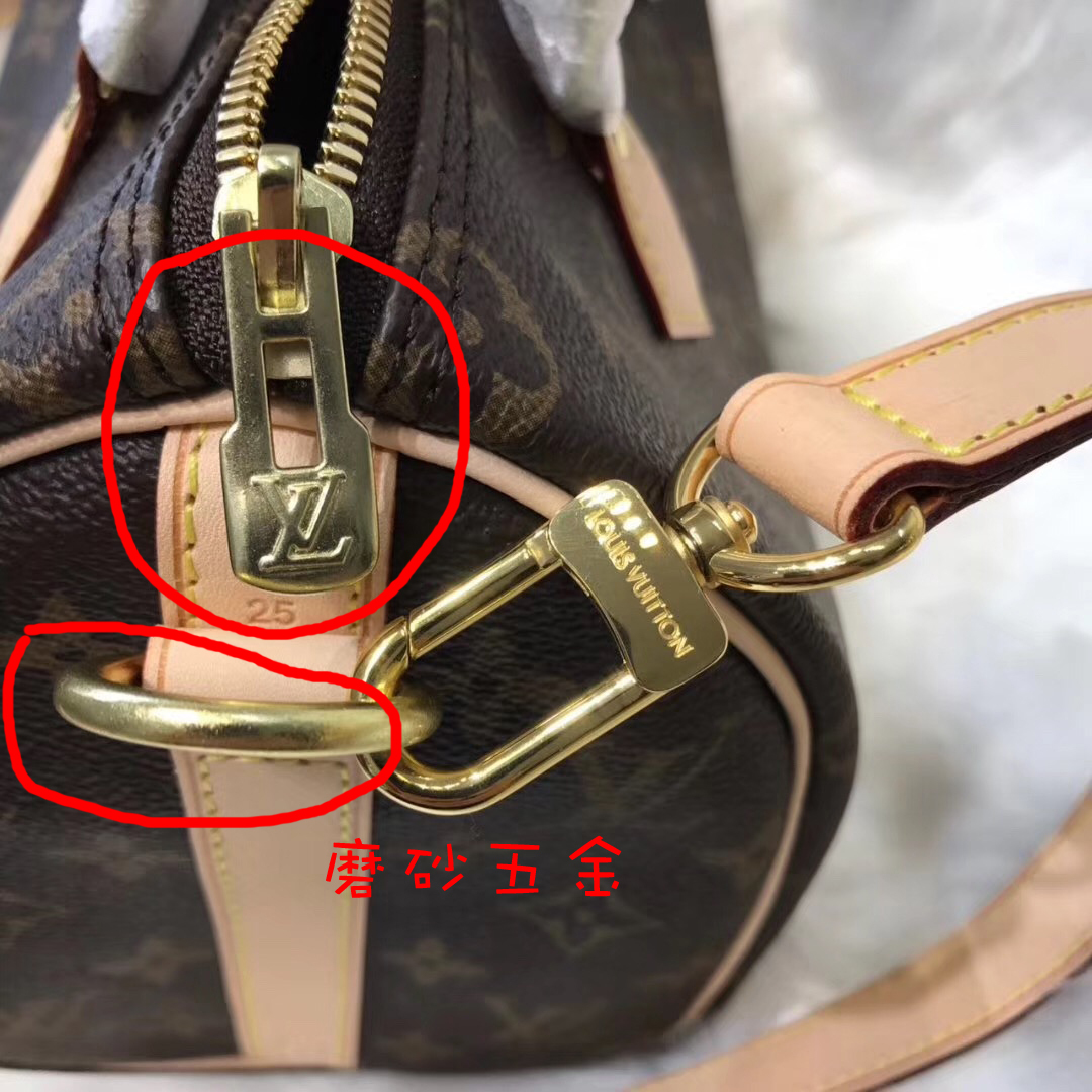 這個重點講一下,lv就是喜歡在一款包包上使用不同的五金,比如speedy,它的包身上的五金是青銅色,磨砂質感,但是并不是沒有光澤哦,而是偏暗啞的光澤感。
