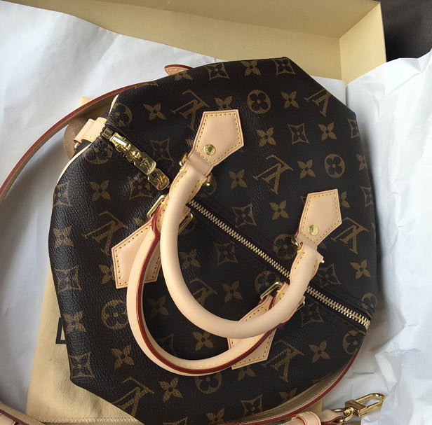 Speedy手袋的手柄是圓柱狀設計,很舒適不勒手,近期的型號還配上了一個肩帶,手袋以拉鏈封口,并配有金屬掛鎖和鑰匙,以提高其安全性。手袋內部有鍍金屬環在里面可掛內部袋。