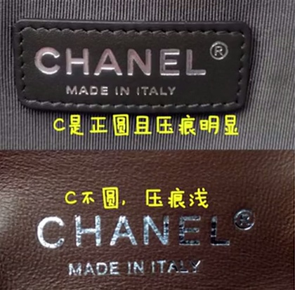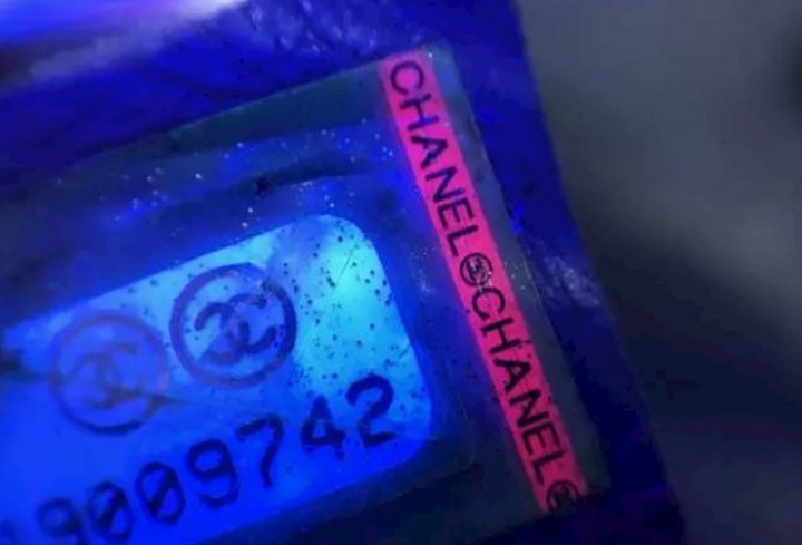 其次,正品內(nèi)標(biāo)用紫光燈照射時(shí),應(yīng)該可以看見(jiàn)熒光紅線上有清晰的Chanel logo。仿品包的字體會(huì)有差異,而且熒光紅線上沒(méi)有l(wèi)ogo標(biāo)志。