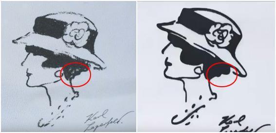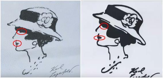 老佛爺筆下的Coco,眉眼清晰,畫(huà)面感鮮活,雖然是簡(jiǎn)筆畫(huà),但十分傳神。相反,假貨的Coco五官難辨,畫(huà)工粗劣。