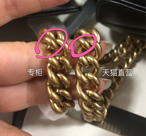 專柜:做舊金屬,圈環(huán)連接處發(fā)黑,圈環(huán)彎處有明顯折痕,類似于擠壓彎曲工藝;天貓直營:閃亮金屬,圈環(huán)連接處細小縫隙,無做舊發(fā)黑,圈環(huán)彎處平滑柔和,與專柜正品完全不一樣。