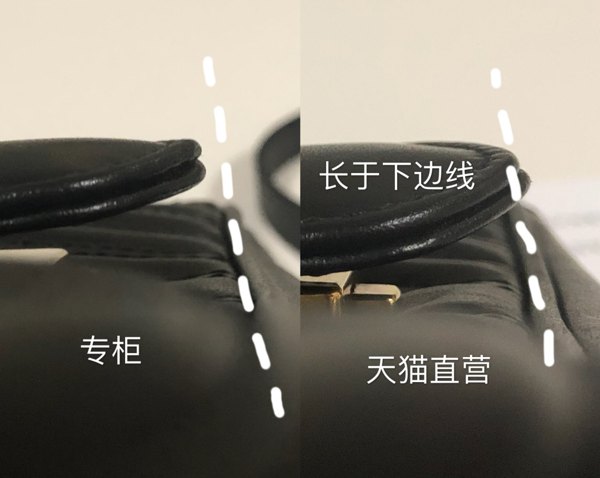 專柜:短于包體底邊線;天貓直營:長于包體底邊線