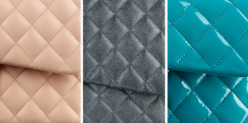 大部分的香奈兒包款是用小羊皮或小牛皮制造的,皮質較暗有凹凸感。包包的身形很挺,不會有塌陷感。特別是羊皮包包,不但觸感好,而且會有一種原皮味。老佛爺在2.55復刻版上使用了一種復古效果的皮材,讓它看起來比小牛皮質的Classic flap更有懷舊感。
