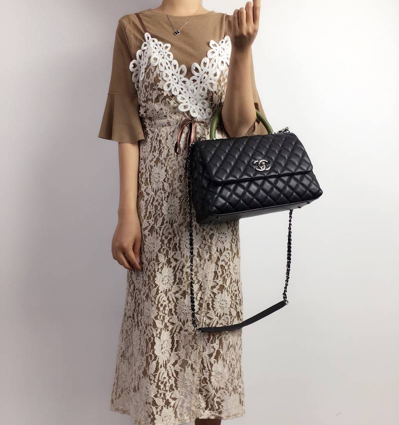 這款以Coco小姐本尊命名的Coco handle bag,它是香奈兒包包為數(shù)不多的有手柄的包款,半圓形手柄配上單肩鏈條,是這個(gè)包最出彩的部分,背在身上優(yōu)雅,提在手上復(fù)古,這款包不管什么顏色什么大小背在身上都是全身搭配的點(diǎn)睛之筆,沒有任何季節(jié)的束縛,也沒有任何場合的局限。