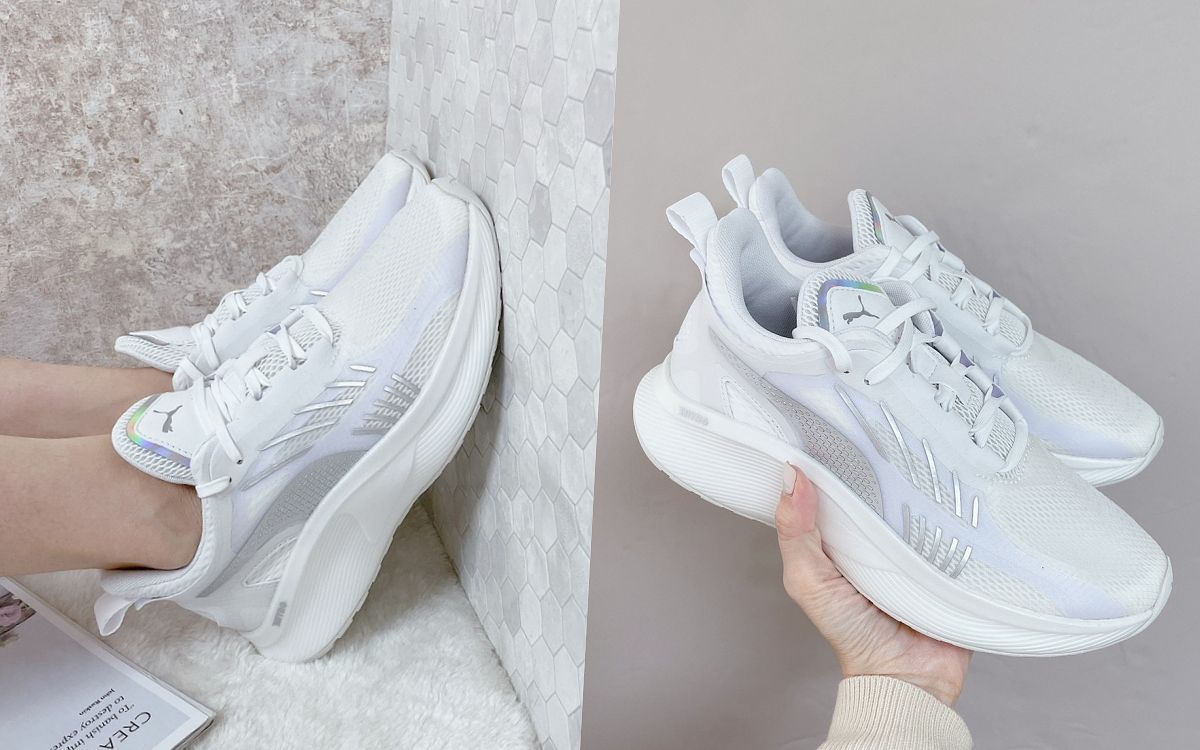PUMA這雙新作品最值得注目的,就是將劃時代科技注入,讓運動鞋款能夠同時擁有機能與時髦外在,兩者都無須妥協!專屬厚氮氣鞋底輕易拉抬雙腿比例、腳感更是柔軟舒適又Q彈,銀色光束與白色網布相互交織、讓整雙鞋款揉入滿滿仙氣、令人無法忽視!