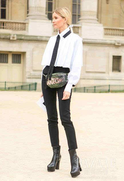 這款鑲滿亮片的Chanel包包其實是一款單肩包,被創意的變成了腰包造型十分新奇獨特,也為整套簡約帥氣的look加分不少