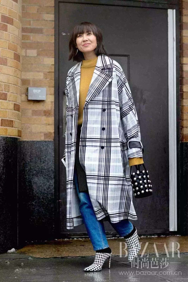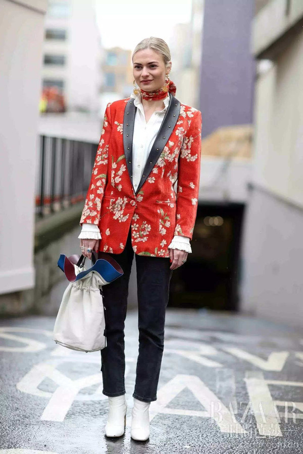 這樣的印花西裝搭配純色水桶包,會顯得不那么花哨而更加氣質