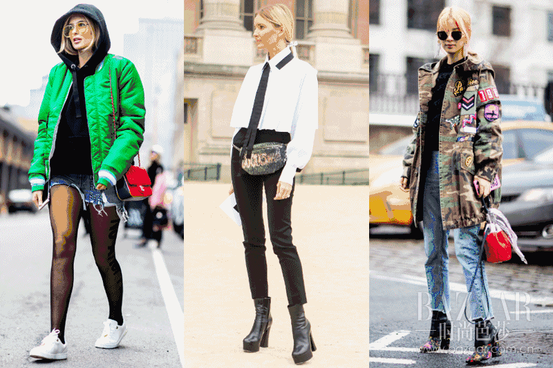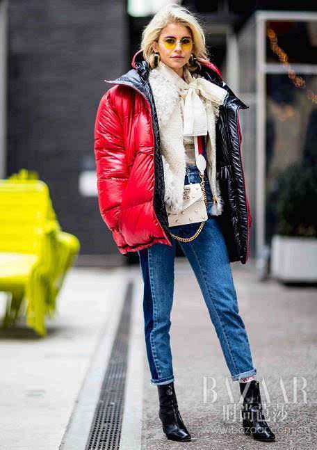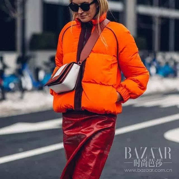 亮色的運動風棉服混搭皮革搭扣包,整個造型不過分的突兀又十分穩重