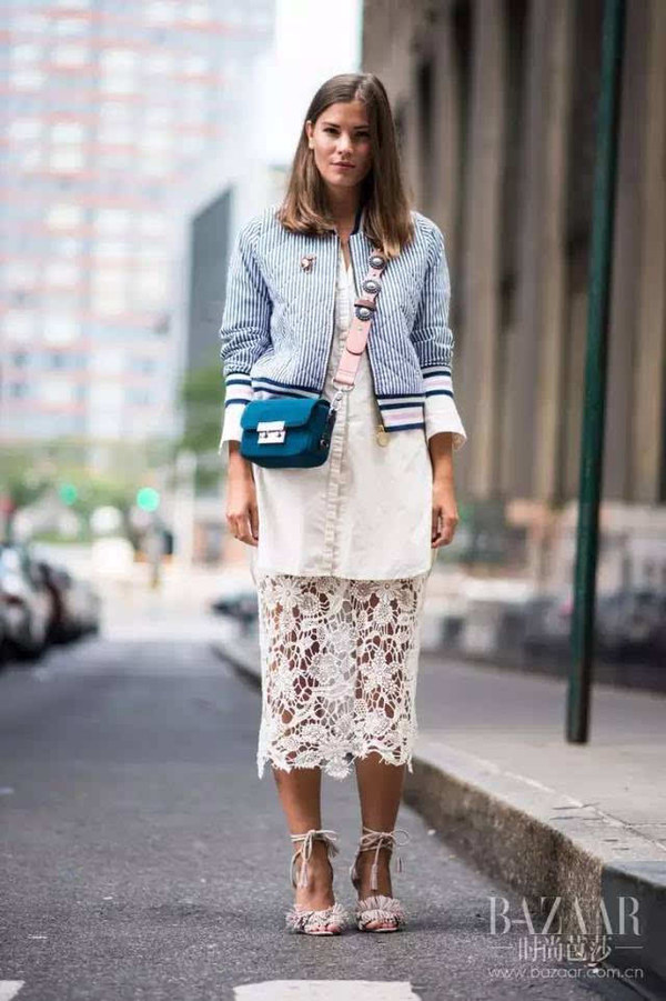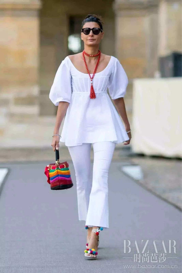 整套純白色的look中,水桶包和涼鞋的彩色毛球飾品襯托了整套look,并且兩者相呼應,顯得白色不那么的單調